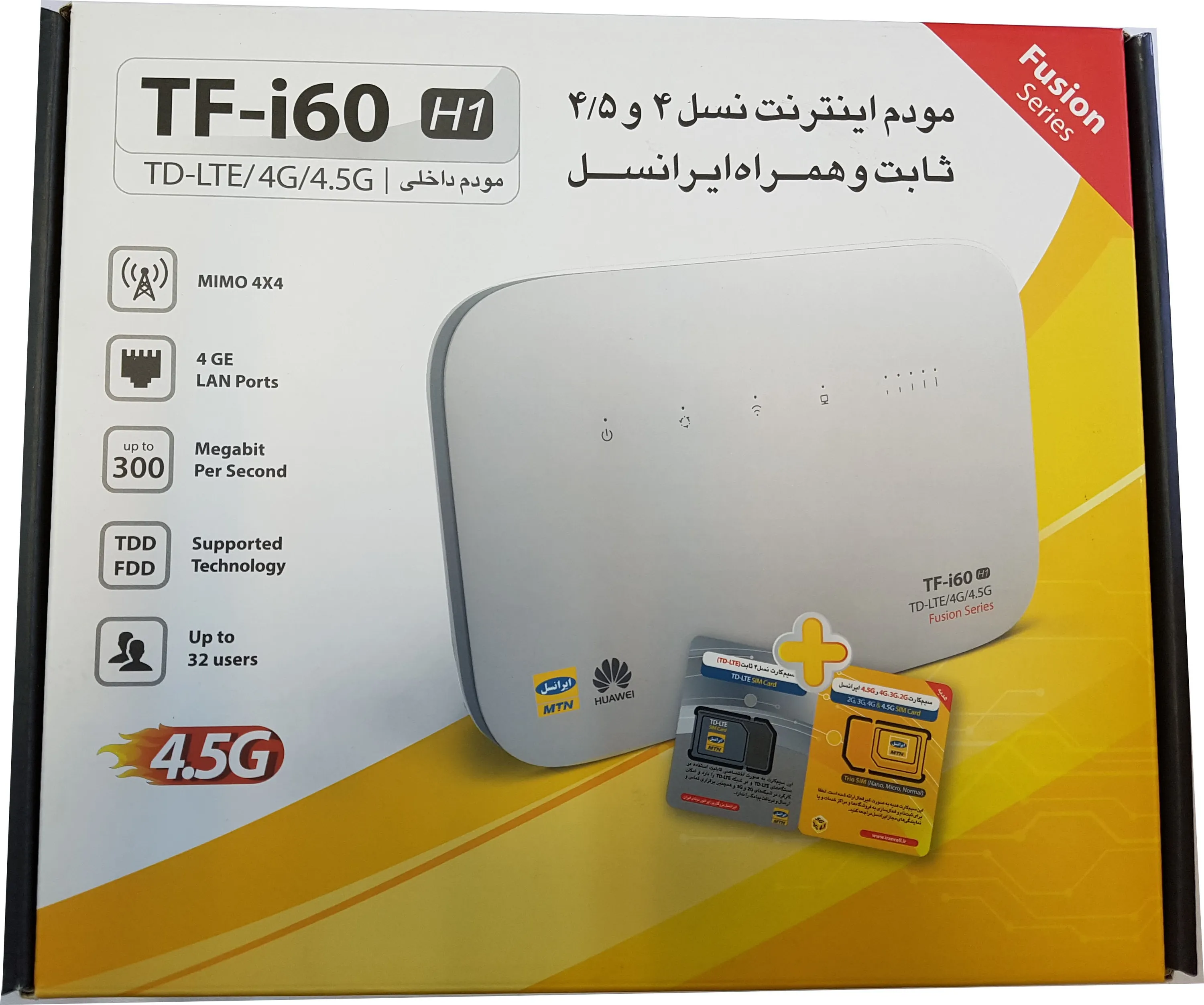 معرفیمودم ایرانسل TF-i60 LTE Cat6بدون سیم کارت هدیهدارای 4 پورت شبکه Lanدارای پورت Wan پشتیبانی از سیم کارت های اعتباری و TD-LTE ایرانسلدارای وای فای جهت اتصال 32 دستگاه وای فای بصورت همزمان **در صورت نیاز یه سیم کارت TD خام یا با بسته میتوانید از قسمت سیم کارت ها آن را خریداری نمایید **